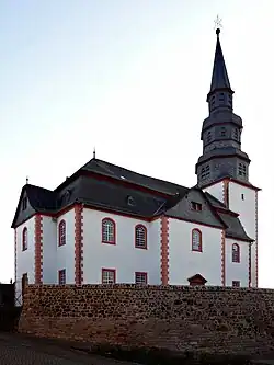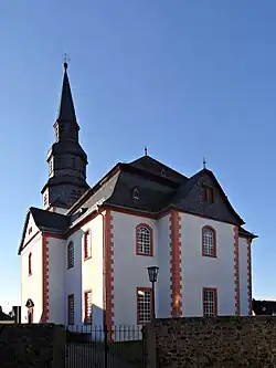 Im letzten Viertel des 17. Jahrhunderts wurde die mittelalterliche Kirche baufällig und 1698/1699 abgetragen. Das heutige Gotteshaus entstand unter Graf Wilhelm Moritz von Solms-Braunfels in den Jahren 1698 bis 1703.[12] Angesichts der Bevölkerungsanzahl von 563 Personen im Jahr 1694 war die Kirche mit 700 Sitzplätzen überdimensioniert angelegt.[13] Durch den damaligen Pfarrer Johann Huldrich Werdmüller, der aus Zürich stammte, wurden Verbindungen zu Schweizer Gemeinden gelegt, die für den Kirchenbau spendeten. Der Graf unterstützte das Bauprojekt finanziell und erstellte verschiedene Pläne und Zeichnungen. Er reiste in die Schweiz, um die Gemeinden um Spenden zu bitten. Zudem schlossen sich die benachbarten reformierten Kirchen des Ortes Gambach mit Spenden an.[14] Vom Vorgängerbau wurden Steine, Holz und Sandsteinplatten, die mit Ornamenten verziert waren, wiederverwendet. Am 5. August 1703 vernichtete eine Feuer den gesamten Ort. Westlich des Gambachs waren fast alle Gebäude zerstört oder schwer beschädigt. Nur die fast fertiggestellte neue Kirche, Rathaus, Pfarrhaus und einige Hofreiten östlich des Gambachs blieben verschont.[15] Die Einweihung der Kirche erfolgte vier Wochen später, am 2. September 1703. Der Turm wurde aus Kostengründen erst 1710 fertiggestellt.[16] „Creutz und Gickel“ als Bekrönung folgten 1721.