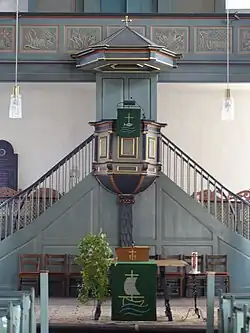 Kanzel, Abendmahlstisch und Orgel sind auf der Mittelachse angeordnet. Die polygonale, hölzerne Kanzel aus der Erbauungszeit der Kirche ruht auf einem Pfeiler und hat beidseitig einen Treppenaufgang. Sie wurde im Zuge der Emporenerweiterung für die Orgel vorgerückt. Die Kanzelfelder mit rechteckigen Füllungen werden von Ecksäulen begrenzt. Die marmorierten Säulen stehen auf kleinen Konsolen und enden in kleinen Kapitellen. Den oberen Abschluss des Kanzelkorbs bildet ein profilierter Gesimskranz. Der unregelmäßig sechseckige Schalldeckel ist reich profiliert und hat ein flaches Zeltdach mit schlichtem Kreuz als Bekrönung. Eine 1934 angebrachte Bemalung des Schalldeckels mit einem Bibelvers wurde 1961 wieder rückgängig gemacht.[25] Entsprechend reformierter Tradition verfügt die Kirche über keinen Altar, sondern über einen Abendmahlstisch, auf dem die offene Bibel liegt.