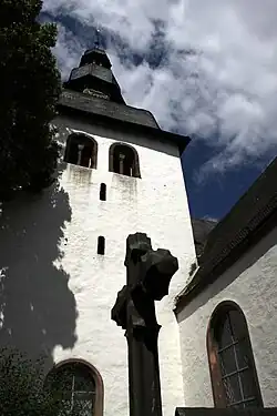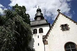 Die Kirche war ursprünglich dem Patrozinium des hl. Nikolaus unterstellt. Der im Kern zweijochige Saalbau mit Westturm wurde Ende des 12. Jahrhunderts errichtet und danach schrittweise zur dreischiffigen Halle mit Quergiebeln erweitert. Das Nordschiff wurde 1660 angebaut und 1896 wurden nach Verfall das Südschiff und die Chorapsis angefügt. Gleichzeitig wurde der gesamte Bau in neuromanischen Formen übergangen. Eine umfassende Renovierung wurde 1977/78 durchgeführt.