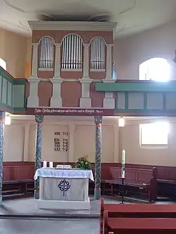 Der Chorbereich ist um eine Stufe erhöht. Der Altar ist schlicht aufgemauert und weiß verputzt. Er wird von einer profilierten, rot gestrichenen Platte abgeschlossen. Im Chorabschluss sind zwei Reihen mit Kirchenbänken aufgestellt. Der Fußboden wird aus roten Sandsteinplatten gebildet, unter den Bänken im Schiff ist Parkett gelegt.