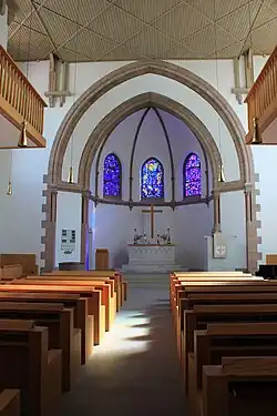 Über dem Hauptportal befindet sich ein Relief (Christus) des Bozner Steinbildhauers Andreas Kompatscher.[6] Das Kircheninnere erhielt im Zuge des Neuaufbaus nach der Zerstörung eine einfache, glatte Holzdecke. Die Wände wurden weiß gestrichen. Den künstlerischen Höhepunkt bildet die Ausstattung des Chorraumes mit Betonglasfenstern des Stuttgarter Künstlers Christian Oehler.[7]