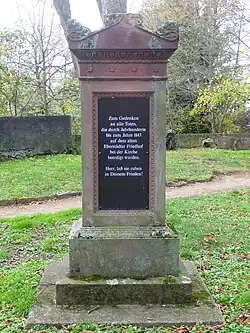 Wenige Meter südwestlich der Dreifaltigkeitskirche steht ein Denkmal aus rotem Sandstein. Das Denkmal erinnert an den alten Eberstädter Friedhof auf dem Areal der Kirche.