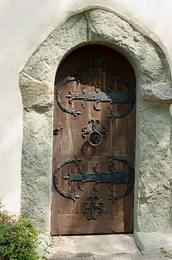 Die beiden romanischen Portale an der Südseite besitzen noch ihre mittelalterlichen Eisenbeschläge. Das größere Portal unter dem offenen Vorzeichen wird in das späte 12. Jahrhundert datiert. Es ist in einen Rechteckrahmen gefasst und wird von eingestellten Säulen flankiert. Chor und Sakristei werden durch zwei kleine Rundbogenfenster in mittlerer Höhe belichtet. In die Langseiten der Kirche sind Rundbogenfenster eingelassen; das Rundfenster am westlichen Ende der Südwand war ursprünglich ebenfalls ein Rundbogenfenster. Die Westseite ist fensterlos. Die Gewände der Fenster weisen rote Quaderbemalung auf.