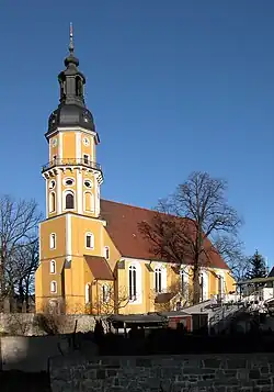 Am 5. November 1682 wurde der Grundstein zur heutigen Pfarrkirche gelegt. Christoph Gottschick aus Pirna leitete den Bau. Am 13. August 1689 wurde der Bau unter Freiherr Maximilian von Schellendorff eingeweiht. 1891 wurde unter der Leitung des Architekten Adolph Canzler der Kirchenraum im Stil des Historismus umgebaut. In dieser Gestaltung präsentiert sich der Raum größtenteils noch heute.