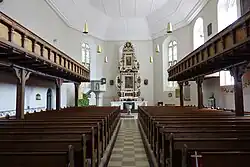 Das Bauwerk ist eine schlichte, verputzte Saalkirche mit dreiseitigem Schluss und einem Turm, der in ein oktogonales Glockengeschoss mit Umgang überführt ist und mit einer geschweiften Haube und Laterne abgeschlossen ist. Der weiträumige Innenraum ist mit eingeschossigen Emporen an Nord-, West- und Südseite versehen und mit einer Flachdecke mit Voute abgeschlossen.