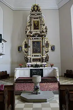Der Mittelteil des Altars ist dreigeteilt: Mittig ein Bild der Kreuzigung Jesu, daneben jeweils eine Säule mit Akanthuskapitell, rechts neben der Kreuzigung das Bild der Grablegung Christi, links die Andacht Jesu im Ölgarten. Über der Kreuzigung ist ein gesprengter Bogengiebel mit einem Engelskopf angeordnet. Darüber befindet sich ein Gemälde der Auferstehung, das von den Evangelisten Johannes und Lukas flankiert ist. Der Aufbau wird durch ein Monogramm mit den ineinander verschlungenen Lettern JESVS in einem Lorbeerkranz mit Krone bekrönt.