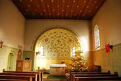 Der Innenraum der Kapelle umfasst rund sieben auf zehn Meter unter einer schlichten flachen Holzdecke, den Altarbereich bildet eine halbrunde Apsis. Die Wandbemalung erfolgte zur Bauzeit halbhoch in Schablonentechnik, die eine kassettierte Holzvertäfelung imitierte. Im Jahr 1957 wurde der Innenraum umgestaltet und im Langhaus komplett weiß gestrichen; die beiden Fenster in der Apsis wurden vermauert und die dortige Wandbemalung in Jugendstilornamenten durch ein Fresko des Feldkirchner Kunstmalers Konrad Schmid-Meil ersetzt.