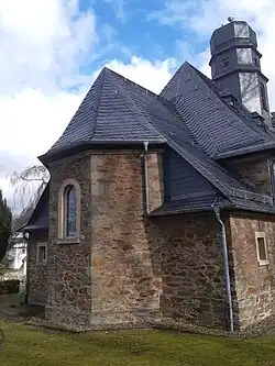 Die Saalkirche ist nicht geostet, sondern nach Südwesten ausgerichtet. Sie wurde am südlichen Ortsrand aus unverputztem Bruchsteinmauerwerk mit Eckquaderung über einem Sockel errichtet. Die Ecken des Kirchenschiffs sind im Osten abgeschrägt. Dem großen Walmdach sind an jeder Seite drei kleine Dachgauben mit Dreiecksgiebeln aufgesetzt. Das Gotteshaus wird durch ein rundbogiges Ostportal unter einem verschieferten Vorbau erschlossen, der von zwei achtseitigen Säulen aus Kunststein getragen wird. Das Schiff wird an den Langseiten durch je zwei große Rundbogenfenster und östlich durch ein niedriges Drillingsfenster belichtet, über dem ein kleines Rundfenster eingelassen ist. Der Chor ist gegenüber dem Schiff niedriger und eingezogen. Er hat nur ein kleines Rundbogenfenster im Westen. Im Süden des Chors schließt sich die kleine Sakristei mit einem kleinen quadratischen Fenster im Süden unter einem Schleppdach an. Die Glasmalereianstalt Ferdinand Müller fertigte das Bleiglasfenster im Chor,[2] das den Auferstandenen zeigt. Die übrigen Fenster weisen Sprossengliederung auf. Der achtseitige Dachreiter mit Zwiebelhaube beherbergt ein Dreiergeläut.