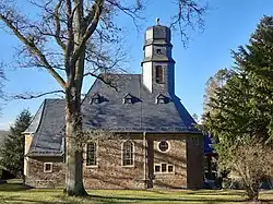 Die Evangelische Kirche in Albshausen in der Stadt Solms im Lahn-Dill-Kreis (Hessen) ist eine denkmalgeschützte Saalkirche. Sie ist aus geschichtlichen und künstlerischen Gründen Kulturdenkmal.[1] Die Kirche wurde 1923–1930 nach einem Entwurf von Ludwig Hofmann im Stil des barockisierenden Historismus erbaut.[2] Sie besteht aus einem Kirchenschiff mit Walmdach, dem im Osten ein Dachreiter mit Zwiebelhaube aufgesetzt ist, einem polygonalen Westchor und einem verschieferten Vorbau für den Eingangsbereich im Osten, der von zwei Säulen flankiert wird.
