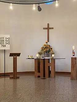 Im Inneren des Baues finden sich runde Formen wieder, der etwa 60 m² große religiöse Raum ist ein Oval, drei runde Fenster bringen Licht in den Raum. „Unser Raum bleibt zunächst farblos. Zwar haben alle Materialien ihre Farbnatur, doch bewusste farbige Tingierung kann Farbnatur in Farbkultur verwandeln. So bleibt eine schöne, künstlerischer Aufgabe für die Zukunft offen.“ (Frank-Rüdiger Hildebrandt: [8])