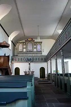 Der Innenraum wird durch eine Spiegeldecke abgeschlossen, die zur Belichtung der Empore durch Stichkappen eingeschnitten wird.[8] Die Boden ist mit Platten aus rotem Sandstein belegt. Das Kirchengestühl hat geschwungene Wangen und vorne Brüstungen. Es lässt im östlichen Teil des Schiffs einen Mittelgang frei, während es im Westteil unterhalb der Empore auf die Kanzel im Süden ausgerichtet ist.