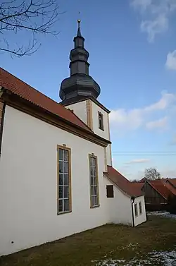 Der eingezogene quadratische Chorturm im Osten des mit einem Satteldach bedeckten Langhauses stammt aus dem 14. Jahrhundert. Ein Sakramentshaus im Chor ist aus dieser Zeit. Der Chorturm wurde 1717/18 aufgestockt und mit einer mehrfach getreppten, barocken, schiefergedeckten Haube bedeckt. Die Sakristei befindet sich an der Südseite des Turms.