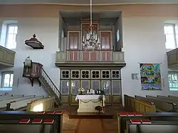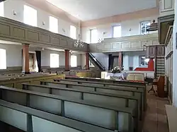 Die dreiseitige, kassettierte Empore an der West-, Süd- und Ostwand ruht auf viereckigen, rot-braun marmorierten Holzpfosten toskanischer Ordnung.[11] Die Emporenaufgänge befinden sich an der Südwand. Altar und Orgel sind axial ausgerichtet.[1] Unter der Orgel verschließt eine verglaste Holzwand die Sakristei.
