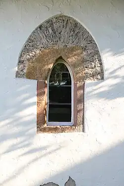 Das Gebäude wird durch ein spitzbogiges Südportal nahe der Westecke erschlossen und durch Stichbogenfenster im Süden sowie ein Stichbogenfenster im Osten belichtet. Die später vergrößerten Fenster haben eichene Holzzargen. Ein kleines rechteckiges, gekehltes Schlitzfenster findet sich in der Westseite und ein kleines, hoch sitzendes Rechteckfenster mit Fase rechts oberhalb des Südportals.[1] Die Nordseite hat ein schmales spitzbogiges Fenster aus Lungstein mit Hohlkehle (1,22 × 0,54 Meter), das aus der Erbauungszeit stammt.[9] Das ursprüngliche Maßwerk ist nicht erhalten. Dem steilen Satteldach ist ein sechsseitiger Dachreiter mit Spitzhelm aufgesetzt, der an die mittelalterliche Formensprache anknüpft. Er beherbergt eine Glocke, die 1633 gegossen wurde und folgende Inschrift trägt: „GEORG SCHERNBERG BEIN GOS MICH IN MARPURG 1633“.[10] Vermutlich stammt die Glocke aus einer anderen Kirche, da der Dachreiter erst 1752 aufgesetzt wurde.[11]