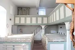 Im Norden und Westen ist eine hölzerne Winkelempore eingebaut, die auf viereckigen Pfosten mit Bügen ruht. Auf der Westempore ist die Orgel aufgestellt. Die Emporenbrüstung weist Füllungen auf. Das Kirchengestühl mit geschwungenen Wangen lässt einen Mittelgang frei. Die polygonale hölzerne Kanzel an der Südwand stammt wahrscheinlich von 1759.[10] Die Kanzelfelder haben profilierte Füllungen und unten und oben einen durchlaufenden Gesimskranz. Ein angrenzender Pfarrstuhl mit durchbrochenem Rautengitter gewährt den Zugang zur Kanzel. Das holzsichtige Taufbecken ist pokalförmig gestaltet.