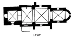 Die Kirche wurde im frühen 13. Jahrhundert im romanischen Stil erbaut und ist eine zweijochige Saalkirche mit einjochigem, eingezogenem Ostchor und Westturm. An den Chor schließt sich eine halbrunde, niedrige Apsis an, die heute als Sakristei genutzt wird.