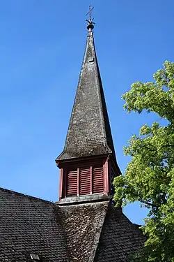 Für den Dachreiter wurde das verschieferte Satteldach im Bereich des westlichen Jochs verbreitert, sodass das kubusförmige Glockengeschoss direkt auf dem Dach aufsitzen kann. Vor den viereckigen, mit Lamellen versehenen Schallöffnungen sind die Zifferblätter der Turmuhr angebracht. Über dem Kubus erhebt sich der verschieferte Spitzturm, der von einem Turmknauf, Himmelsrichtungsanzeiger und Keltenkreuz bekrönt wird.