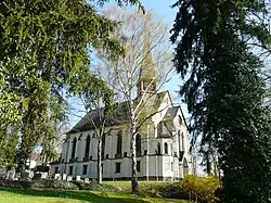 Der neugotische Saalbau besteht aus einem fünfjochigen Langhaus mit einem westlichen Vorbau, der von zwei Treppentürmen flankiert wird. Vom Verputz ausgespart sind einzelne Architekturelemente aus rotem Sandstein. Dem Satteldach ist auf dem ersten Joch ein Dachreiter diagonal aufgesetzt. Ein eingezogener Rechteckchor mit einer Fensterrose aus Plattenmaßwerk bildet den Ostschluss.[1] Im Nordosten schließt sich eine kleine Sakristei an.