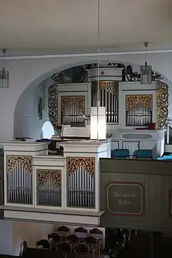 Bis zu Beginn des 19. Jahrhunderts war die Kirche ohne Orgel. 1823 bestand die Möglichkeit eine Orgel aus Pohl-Göns zu kaufen, die für die dortige Kirche für zu klein gehalten wurde. 1827 erwarb die Gemeinde dann die alte Orgel aus St. Michaelis in Oberkleen, die auf die Mitte des 17. Jahrhunderts zurückging. Ab 1837 gab es verschiedene Vorschläge und Angebote, das Werk umzubauen oder zu erneuern. Die Licher Firma Förster & Nicolaus baute 1906 für 4475 Mark ein neues Instrument im alten Barockgehäuse und nahm die alte Orgel in Zahlung. Die Orgel hatte zwölf Register auf zwei Manualen und Pedal.[12] Werner Bosch Orgelbau ersetzte das Werk 1979 für 14.000 DM durch ein zweimanualiges Werk mit 15 Registern unter Einbeziehung von zwei Drittel der alten Pfeifen.[1] In die Brüstung wurde ein Rückpositiv eingebaut, das sich stilistisch an das alte Hauptgehäuse anlehnt. Dessen überhöhter runder Mittelturm wird von zwei Flachfeldern flankiert, während das Brüstungspositiv außen zwei hohe und in der Mitte ein niedriges Flachfeld aufweist. Flachgeschnitzte, durchbrochene Schleierbretter schließen die sechs Pfeifenfelder nach oben ob. Seitlich am Hauptgehäuse sind vergoldete Rocaillen und oben Engel und steigende Löwen und auf dem Mittelturm ein Aufbau mit einem geflügelten Engelkopf angebracht. Die Disposition lautet wie folgt: