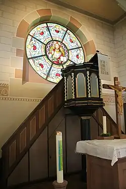 Der liturgische Bereich ist um eine Stufe erhöht und reicht noch in die Vierung hinein. Die polygonale Kanzel von 1742–1745,[11] deren Kanzelfelder durch gedrehte Freisäulen gegliedert werden, steht an der Westwand und hat einen zweiläufigen Zugang mit einer kassettierten Brüstung. Sie geht im Kern ebenfalls auf Müller zurück. Bis 1905 war sie mit Schalldeckel an der südlichen Langseite angebracht.[1] Vor dem Chorbogen sind der Blockaltar und das achtseitige Taufbecken aufgestellt, die beide aus rotem Sandstein gefertigt sind. Der Altar wird von einer überstehenden, schwarzen Mensaplatte bedeckt. Auf ihm ist ein holzsichtiges Altarkreuz mit der Tafelinschrift INRI und einem Kruzifix des Dreinageltypus aufgestellt. Die Orgel steht unter dem alten Ostbogen, der Turm und Schiff verbindet. Das Kirchengestühl mit geschwungenen Wangen bildet in den beiden Flügeln des Querschiffes je einen Block und lässt im Schiff einen Mittelgang frei.