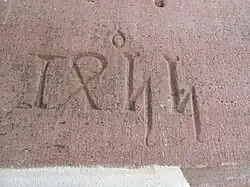 - Das dritte Epitaph ist genau bestimmbar. Ein Lilienkreuz wird von einer rundum angebrachten Inschrift in gotischen Majuskeln umrahmt. Sie lautet: „ANNO MCCCLXV.OB.KATHAERINA.DE.HORNBERG.XVI.KALENDAE.OCTOBRIS.“ zu deutsch: „Im Jahre des Herrn 1365 starb Katharina von Hornberg am 16. Oktober“. Vor der Reformation bestanden in Ebhausen zwei Pfründen zu St. Nikolaus und zu St. Katharina. Die zentrale Bestattung der Katharina von Hornberg gibt Anlass dazu, in ihr die Stifterin der Katharinenpfründe zu sehen.[12]