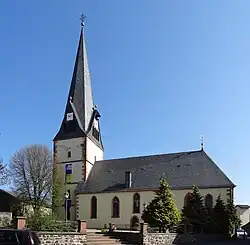 Die Saalkirche geht auf eine bereits zur Zeit des Römischen Reiches gebaute Villa zurück. Ihre Südwand wurde auf römischen Grundmauern errichtet. Das Frigidarium des Bades wurde in karolingischer Zeit durch Anbau einer rechteckigen Apsis an der östlichen Langseite zu einer Kirche umgestaltet. In frühromanischer Zeit wurde der Kirchturm im Westen angebaut, der allerdings wieder abgebrochen wurde, als das Kirchenschiff nach Westen auf die doppelte Länge erweitert wurde. Der im 12. Jahrhundert gebaute eingezogene Chor wurde 1724 durch einen barocken Neubau in Breite des Kirchenschiffs ersetzt.
