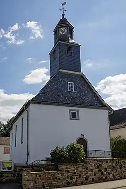 Die in etwa geostete Kirche ist an einer Straßenkreuzung im Ortszentrum aus weiß verputztem Bruchsteinmauerwerk inmitten eines Kirchhofs errichtet.[1] Das barocke Kirchenschiff auf rechteckigem Grundriss wird von einem verschieferten Satteldach bedeckt, dem im Westen ein vollständig verschieferter Dachreiter aufgesetzt ist. In den quaderförmigen Schaft sind drei Schallöffnungen mit Stichbogen für das Geläut eingelassen. Das sechsseitige Obergeschoss hat in abwechselnder Folge drei Schallöffnungen und drei Zifferblätter für die Turmuhr. Die kleine Welsche Haube wird von einem Turmknauf und einem verzierten Kreuz mit Wetterhahn bekrönt. Das Schiff wird an den Langseiten durch je zwei hohe Fenster mit flachem Stichbogen belichtet und durch ein schlichtes Rundbogenportal an der westlichen Schmalseite erschlossen. Über dem Portal ist ein kleines quadratisches Fenster eingelassen. Das westliche Giebeldreieck hat ein weiteres quadratisches Fenster zur Belichtung des Dachbodens und ist verschindelt, während die Ostseite verputzt und fensterlos ist.