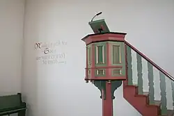 Der Chorraum ist gegenüber dem Schiff um eine Stufe erhöht. Hinter dem einfachen Abendmahlstisch ist die Kanzel mittig an der Ostwand angebracht. Der polygonale Kanzelkorb ruht auf einem Viereckpfosten mit geschwungenen Bügen. Die Kanzelfelder haben hochrechteckige Füllungen mit vergoldeten Profilen. Bei der Renovierung 1964/1965 wurde der rechts der Kanzel angeschlossene Pfarrstuhl, der im oberen Bereich durchbrochenes Rautenwerk hatte, entfernt, da nun eine Sakristei vorhanden war. Links neben der Kanzel ist ein Bibelvers aus Jak 4,8 als Wandspruch gemalt: „Nahet euch zu Gott, so naht er sich zu euch.“ Vor 1965 war über der Kanzel der Bibelvers aus Lk 11,28 zu lesen. An der nördlichen und südlichen Chorwand ist je eine Kirchenbank aufgestellt.