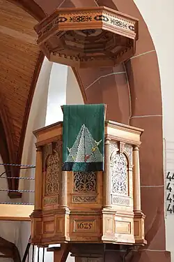 Ältester Einrichtungsgegenstand ist die holzsichtige polygonale Renaissance-Kanzel mit achtseitigem Schalldeckel, die von 1625 datiert.[1] Sie ist aus Fichtenholz gefertigt und reich verziert. Der Sockelbereich weist Furniere und Intarsien aus verschiedenfarbigen Hölzern auf, der Gesimskranz ist profiliert. Kannelierte Dreiviertelsäulen (eine aus Eiche und drei aus Birnbaum) gliedern die fünf Kanzelfelder, die Schnitzereien aus Eiche und rahmendes Werk aus Ahorn aufweisen. Unter Rundbögen sind Rankenornamente mit Schablonen aufgemalt.[8] Im Zuge der Innenrenovierung in den 1960er Jahren wurden ein neuer Altar aus Sandstein, ein neues oktogonales Sandstein-Taufbecken der Firma Dehnel und eine neue Orgel angeschafft.[8] Das hölzerne Kirchengestühl lässt einen Mittelgang frei.