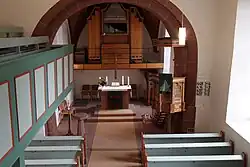 Im Schiff ruht die Flachdecke auf einem Längsunterzug. Ein großer Rundbogen aus rotem Sandstein mit Quaderbemalung öffnet den Chor zum Schiff. Der Chor wird seit 1965 von einem hölzernen Kreuzrippengewölbe abgeschlossen, das auf den alten Konsolsteinen ruht. Das ursprüngliche Steingewölbe ist nicht erhalten und wurde vermutlich in der Mitte des 18. Jahrhunderts oder 1808 herausgebrochen.[8] Im Chor ist seit 1965 eine moderne Empore eingebaut, die als Aufstellungsort für die Orgel dient. Gegenüber der alten Empore ist sie etwas zurückgesetzt und erhöht. Die hölzerne Winkelempore im Norden und Westen stammt aus dem 18. Jahrhundert. Sie wird von schlichten Vierkantpfosten getragen und hat eine schlichte kassettierte Brüstung.[8] Der Fußboden ist seit 1971 mit Sandsteinplatten belegt.[8]