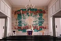 Den Innenraum beherrscht seit 1972 eine monumentale Fresco-Secco-Malerei von Erhardt Jakobus Klonk an der Ostwand.[5] Müllers Jesusbild hängt seitdem beim Emporenaufgang. Klonks Malerei Die Gemeinde auf dem Weg zu ihrer Mitte (oder nach Klonk: Das Paradies) zeigt von oben nach unten Szenen aus der biblischen Heilsgeschichte, der Geschichte Israels und aus dem Leben Jesu, die mit modernen Alltagsszenen kombiniert werden. Im hellen Zentrum steht das Lamm Gottes, umgeben von grünen Bäumen des Lebens.[6]