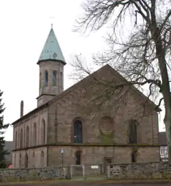 Die große neuromanische Saalkirche aus Quadermauerwerk hat einen schmalen Kirchturm über quadratischem Grundriss im Südosten, dessen oktogonales Obergeschoss hinter den Klangarkaden den Glockenstuhl beherbergt. Unter seiner Dachtraufe befindet sich ein Bogenfries. Bedeckt ist er mit einem spitzen Helm. Die Bogenfenster im Kirchenschiff sind zweigeschossig angeordnet, getrennt durch ein Gesims. Das Obergeschoss ist mit Lisenen gegliedert und hat unter der Dachtraufe einen Bogenfries. Der Innenraum hat dreiseitig umlaufende Emporen. Das Wappen der Riedesel wurde 1715 gemalt.