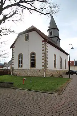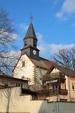 Die nicht exakt geostete, sondern leicht nach Ost-Nordost ausgerichtete Kirche ist im Ortszentrum aus Bruchsteinmauerwerk errichtet. Sie ist weiß verputzt, nur der Sockelbereich, die Eckquaderung und die sandsteinernen Gewände von Türen und Fenstern mit ihren tiefen Laibungen sind vom Verputz ausgespart.[5] Die schlichte Saalkirche[6] hat einen geraden Ostschluss und wird von einem Schopfwalmdach mit roten Ziegeln bedeckt, dem im Westen ein achtseitiger, grau verschieferter Dachreiter aufgesetzt ist. Über dem kubusförmigen Schaft, an dessen Nord- und Südseite ein weißes Zifferblatt für die Turmuhr angebracht ist, leitet ein vorkragendes Zeitdach zum oktogonalen Glockengeschoss über, in das vier rundbogige Schallöffnungen für das Geläut eingelassen sind. Die Glockenstube beherbergt ein barockes Dreiergeläut, das Johann Peter Bach 1750 (Schlagton es2), 1760 (g2) und 1765 (c2) mit dem Motiv eines Moll-Dreiklangs goss.[6] Der achtseitige Spitzhelm wird von einem Turmknauf, einer reich verzierten schmiedeeisernen Windrose und einem vergoldeten Wetterhahn bekrönt.[5]