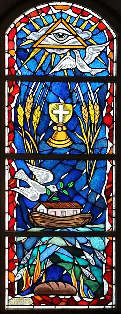 Die Südfenster sind als Bleiglasfenster mit kräftigen Farben gestaltet. Das östliche Fenster zeigt die Heilige Familie im Stall von Bethlehem und das westliche Christus mit ausgebreiteten Armen auf einem Berg vor einer Menschengruppe stehend. Das Mittelfenster ist viergeteilt: unten fünf Fische und ein Brot, darüber die Arche Noah mit einer weißen Taube, dann ein Abendmahlskelch mit einem weißen Kreuz, flankiert von sechs Getreideähren, und im Bogenfeld das Auge der Vorsehung in einem Dreieck mit Strahlenkranz und einer weißen Taube.