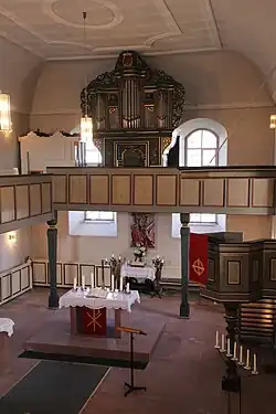 Im Jahr 1775 baute Orgelbauer Johann Friedrich Dreuth eine neue Orgel,[9] der die Orgel anschließend auch in Pflege hatte.[10] Der fünfachsige Prospekt mit einem überhöhten, trapezförmigen Mittelturm und zwei kleinen seitlichen Spitztürmen basiert auf einem Prinzipal 4′. Flachfelder vermitteln zwischen den Türmen. Über dem Mittelturm ist in einem bekrönten Oval ein Wappen der Landgrafschaft Hessen-Kassel angebracht, das von zwei steigenden, vergoldeten Löwen gehalten wird. Über den niedrigen Pfeifenflachfeldern sind über einer Kämpferleiste zwei Felder angebracht, sodass das Kranzgesims in derselben Höhe mit den Spitztürmen abschließen kann. In dem linken Feld ist eine rote Rose, rechts eine rote Tulpe gemalt; das Untergehäuse seitlich des Spieltischs ist durch gemalte Blumengebinde verziert. Die Pfeifenfelder schließen nach oben mit vergoldeten durchbrochenen Schleierbrettern ab. Die Blindflügel an den Seiten und auf dem oberen Gesims bestehen aus durchbrochenem Rankenwerk.[11] Von der Orgel sind neben dem Gehäuse sechs Register und der originale Spieltisch erhalten.