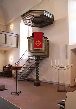 Die polygonale hölzerne Kanzel in brauner Fassung mit flachem achteckigen, profilierten Schalldeckel steht auf einer schlanken gedrehten Säule mit viereckigem Fuß und Würfelkapitell. Die Kanzelfelder des Kanzelkorbs haben hochrechteckige kassettierte Füllungen, deren Profile ebenso wie die Kranzgesimse vergoldet sind. Die Füllungen werden von Wellenprofilen umschlossen.[7]