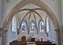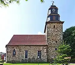 Die Kirche aus Bruchsteinen war ursprünglich eine Wehrkirche. Das im Kern romanische Kirchenschiff wurde 1489 erhöht und mit einem gleich breiten, dreiseitig geschlossenen, mit einem Kreuzrippengewölbe überspannten Chor erweitert. Der Kirchturm im Westen erhielt bei der Sanierung 1791 einen schiefergedeckten zweistufigen Aufsatz mit abgeschrägten Ecken an den vier Seiten. Im unteren Teil steht der Glockenstuhl, in den oberen ist die Turmuhr eingebaut. Den Abschluss des Turms bildet eine bauchige Haube. Die Fenster im Chor sind spitzbogig, die im Kirchenschiff rechteckig.