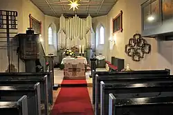 Die Flachdecke im Innenraum ist im Chor niedriger als im Schiff. Deckenleisten gliedern die Decke in quadratische Felder mit einzelnen Rauten in der Mitte des Chors. Im Westen und Süden sind hölzerne Winkelemporen eingebaut, die im Westen ruht auf zwei vierseitigen Holzpfosten. Die kassettierten Brüstungsfelder sind mit floralen Girlanden bemalt. Unter der Empore wurde 2021 eine Inschrift freigelegt: „* Im Jahre Christi 1932 wurde diese Kirche erweitert und wiederhergestellt * Gott ist unsere Zuversicht und Stärke * Psalm 46,2“.[10] Eine Treppe in der Südwestecke führt auf die Empore. Durch die Innenrenovierung 1931/1932 erhielt die Ausstattung durch die dunkelblaue Farbgebung, den Freipfeifenprospekt der Orgel und die Deckenleisten einen expressionistischen Charakter.[11]