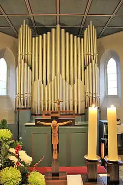 Die heutige Orgel wurde 1934 im Zuge der Kirchenerweiterung von Förster & Nicolaus Orgelbau mit pneumatischen Kegelladen hinter einem Freipfeifenprospekt im Stil des Expressionismus gebaut.[16] Sie steht hinter dem Altar und hat zehn Register auf zwei Manualen und Pedal. Der freistehende Spieltisch, der zunächst am Übergang zum Seitenschiff stand, wurde später hinter den Altar umgesetzt, um die zeitliche Verzögerung der Traktur zu reduzieren. Die Orgel hat folgende Disposition:[17]