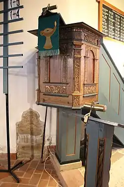 Die Schnitzkanzel im Knorpelstil auf quadratischem Grundriss datiert im Grunde aus dem 17. Jahrhundert. In den Kanzelfeldern ruhen die Rundbögen auf Kapitellen über Schuppenpilastern.