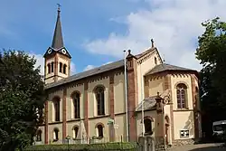 Das vierachsige Langhaus wird von einem Satteldach bedeckt, dem kleine Gauben und an der Ostseite ein Steinkreuz aufgesetzt sind. Der Fünfachtelschluss ist gegenüber dem Langhaus niedriger und eingezogen. Lisenen und Eckpilaster an Langhaus und Chor gehen unterhalb der Traufe in einen Rundbogenfries über. Den Eckpilastern am Langhaus sind stilisierte Blütendolden aufgesetzt. Ein umlaufendes Gesims gliedert in zwei Fensterzonen. Die obere Zone hat Rundbogenfenster mit zweibahnigem Maßwerk und Rundfenster im Bogenfeld und die untere Zone des Langhauses kleine Rundbogenfenster. Der Chor wird durch drei Fenster belichtet und von niedrigen Annexbauten unter einem Pultdach flankiert. Der nordöstliche Anbau dient als Sakristei und der südöstliche als Nebeneingang vom Goetheplatz her. Das Hauptportal im Turmrisalit wurde ursprünglich von zwei Säulen flankiert, aber in den 1960er Jahren in schlichterer Form umgestaltet.[1]
