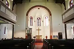 Der Innenraum wird durch einen offenen Dachstuhl abgeschlossen, dessen verbretterte Konstruktion auf Wandstielen als Konsolen ruht. Die Ankerbalken sind mit Holzzapfen verziert. Im Chor tragen kleine Konsolen das Chorgewölbe. Ein großer Rundbogen öffnet den um zwei Stufen erhöhten Chor zum Schiff. Er trägt den Bibelvers: „Jesus Christus gestern und heute und derselbe auch in Ewigkeit“ aus Heb 13,8 . Die Kirchenausstattung ist weitgehend bauzeitlich.[18] Der Fußboden ist mit Steinplatten belegt, während sich unterhalb des Kirchengestühls ein Holzboden befindet. Das Gestühl aus Tannenholz lässt einen Mittelgang frei.[8]