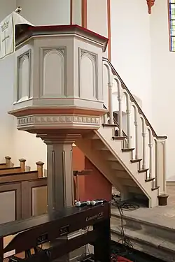 Die dreiseitig umlaufende Empore reicht an den Langseiten nicht bis an die Ostwand heran. Die polygonale Kanzel aus Eichenholz mit kassettierten Füllungen in den Kanzelfeldern ist am nördlichen Chorbogen aufgestellt. Nicht mehr vorhanden ist der originale Schalldeckel. Der schlichte Altar aus Haustein ist um eine Stufe erhöht und trägt vorne ein griechisches Kreuz in einem Kreis. In den 1950er Jahren wurde das schlichte hölzerne Altarkreuz gefertigt.[19] Reinhold Atzbach fertigte 2002 den pokalförmigen Taufstein aus Kiefernholz, der eine 1883 gestiftete Taufschale trägt. Der Grabstein für Johann Wilhelm Lantz († 1833), der beim Bergbau ums Leben kam, wurde in der rechten Chorwand eingemauert.[1]