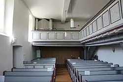 Im Nordwesten ist eine Winkelempore eingebaut, die auf achteckigen Pfosten mit Bügen ruht. Die Westempore dient als Aufstellungsort für die Orgel. Die Brüstung hat schlichte querrechteckige Füllungen mit marmorierter Bemalung.