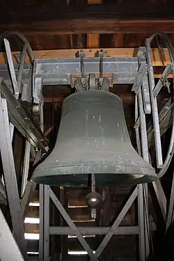 Die Glockenstube beherbergt ein Zweiergeläut. 1673 entwendeten durchziehende französische Truppen eine Glocke, die durch eine Stiftung des Greifensteiner Grafen ersetzt wurde. Wilhelm Rincker goss 1807 eine Glocke, die 1834 zersprang[11] und ein Jahr später durch Rincker in größerer Form umgegossen wurde. Da die Glocke durch die Baumaßnahmen am Ende des 19. Jahrhunderts einen Sprung erhalten hatte, wurde sie von Rincker 1899 mit einem Durchmesser von 0,93 Meter umgegossen. Die Zivilgemeinde bezahlte im selben Jahr eine zweite Glocke. Eine im Ersten Weltkrieg an die Rüstungsindustrie abgelieferte Glocke wurde 1926 durch Rincker ersetzt. Sie trägt die Inschrift: „Niemand hat größere Liebe denn die, dass er sein Leben lässt für seine Freunde, Joh. 15, 13. W. Klas, K. Pletsch, H. Gross, G. Dross, L. Rumpf, F. Biemer, L. Mohr, K. Geissler, F. Hormel, K. Klas, W. Kohlhauer, H. Biemer, F. Schweitzer. Mich Goss 1926 F. + W. Rinker in Sinn Nr. 3557.“ Die andere Glocke erlitt 1942 dasselbe Schicksal und ging verloren. 1951 schaffte die Gemeinde eine Stahlglocke des Bochumer Vereins an, die folgende Inschrift trägt: „O Land, Land, höre des Herren Wort, Jeremia 22, Vers 29, 1951“.[12]