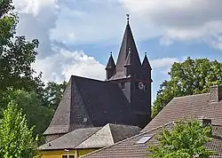 Die Saalkirche wurde nach einem Entwurf von Oskar Hossfeld gebaut. 1911 wurde der Grundstein gelegt und am 21. Juli 1912 wurde sie eingeweiht. Die alte Kapelle am Friedhof, sie war längst zu klein, wurde dann abgerissen. Die alte Orgel von 1717 wurde übernommen, ebenso die kleine Kirchenglocke, die im Glockenstuhl des verschieferten Dachturms mit zwei weiteren hängt, die 1950 und 1962 gegossen wurden. Letztere stammt von der Glocken- und Kunstgießerei Rincker. Der Dachturm ist mit einem spitzen Helm bedeckt, der von kleinen Ecktürmchen flankiert wird.