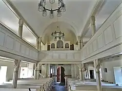 Der Innenraum hat Emporen an drei Seiten. In der Mitte ist er mit einem Tonnengewölbe überspannt. Über den seitlichen Emporen befinden sich Flachdecken.