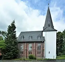 Der mittelalterliche quadratische Chorturm der Saalkirche wurde 1242 erbaut. Den ins Achteck überführten, schiefergedeckten Helm erhielt er 1456. Hinter den Klangarkaden in seinen Dachgauben befindet sich der Glockenstuhl.