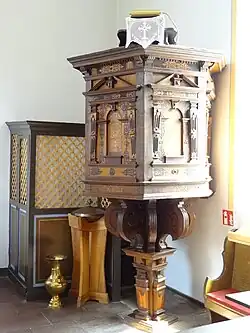 Wertvollstes Inventarstück ist die polygonale Renaissance-Kanzel in der Südostecke, die im Jahr 1623 für die Marienstiftskirche Lich gefertigt wurde. Als die Stiftskirche 1859 eine neue Kanzel erhielt, wurde die alte der Kirche in Hausen vermacht.[6] Im Jahr 1765 wurde sie vom Licher Kirchenmaler Daniel Hisgen neu gefasst. Die Kanzel ohne Schalldeckel ist mit Intarsien und Schnitzereien reich verziert und diente den Kanzeln von Fauerbach vor der Höhe, Hoch-Weisel und Nieder-Weisel als Vorbild.[7] Sie steht auf einem viereckigen podestartigen Fuß, über dem volutenförmige Bügen den Kanzelkorb stützen. In den Kanzelfeldern sind rundbogige Nischen mit Architrav und gesprengtem Giebel eingelassen. Der Kanzelzugang wird durch einen Pfarrstuhl ermöglicht, der im oberen Teil durchbrochenes Rautenwerk hat.