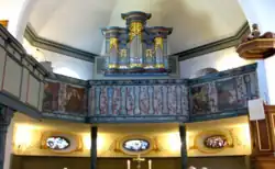 Die hölzerne Orgelempore zieren die in den Innenraum zugewandten Porträts der 4 Evangelisten Matthäus, Markus, Lukas und Johannes. Die erste Orgel der Kirche, wurde 1721 von Johann Christian Dauphin gebaut. Sie hatte zunächst acht Register auf einem Manual. Das Pedal wurde 1784 ergänzt. 1912 wurde in den alten Prospekt eine Orgel von G. F. Steinmeyer & Co. mit 15 Registern, zwei Manualen und Pedal gebaut; sie wurde 1982 restauriert.[1][2]